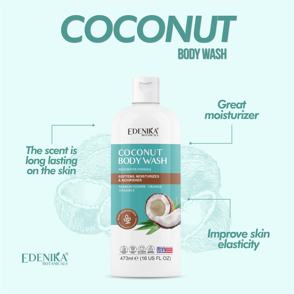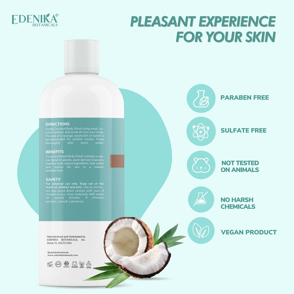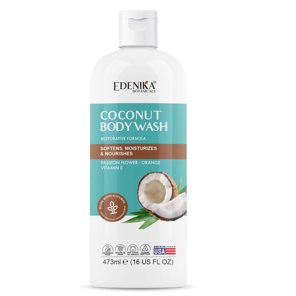We are passionate about helping everyone embrace healthy skin. Edenika Botanicals Coconut Body Wash is made with Certified Organic Ingredients, such as Passion Flower, Orange, and Vitamin E. Also is free of harsh chemicals, sulfate-free, paraben-free, cruelty-free, and made in the USA. Our lathery body wash gently cleanses your skin leaving a glowing healthy look, a great choice for all skin types, including sensitive and dry skin. Pamper yourself by massaging a small amount of body wash onto wet skin and enjoy the experience of creating your own spa with Edenika Botanicals. Safe for daily use, its sweet tropical scent provides a refreshed and relaxed feeling, leaving your skin soft, radiant, and hydrated.