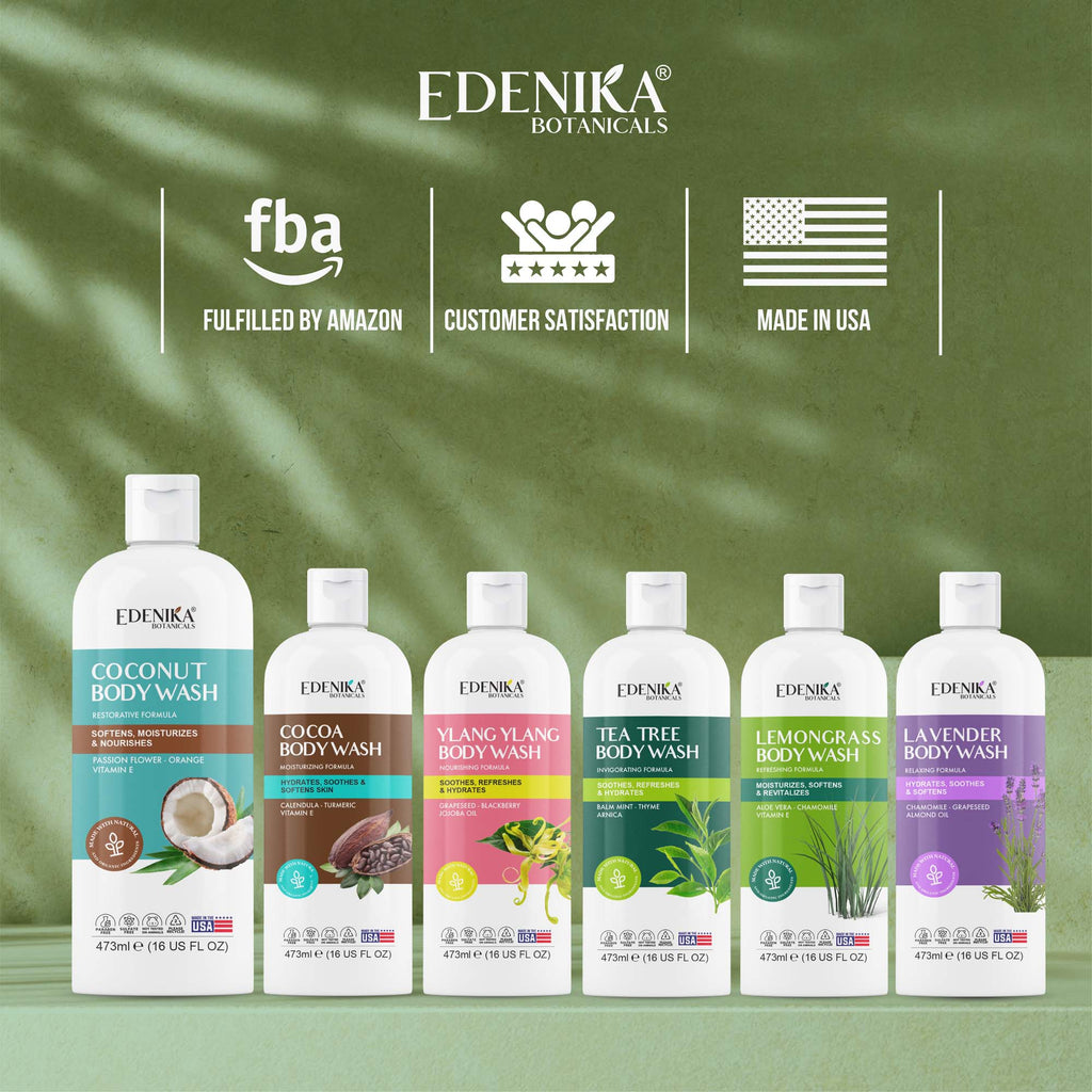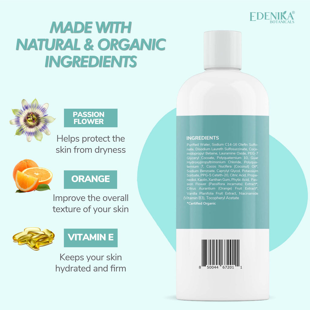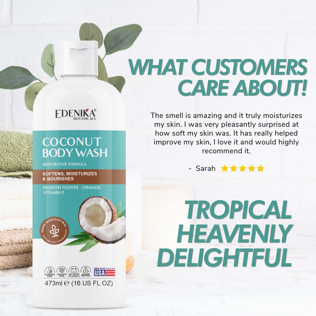We are passionate about helping everyone embrace healthy skin. Edenika Botanicals Coconut Body Wash is made with Certified Organic Ingredients, such as Passion Flower, Orange, and Vitamin E. Also is free of harsh chemicals, sulfate-free, paraben-free, cruelty-free, and made in the USA. Our lathery body wash gently cleanses your skin leaving a glowing healthy look, a great choice for all skin types, including sensitive and dry skin. Pamper yourself by massaging a small amount of body wash onto wet skin and enjoy the experience of creating your own spa with Edenika Botanicals. Safe for daily use, its sweet tropical scent provides a refreshed and relaxed feeling, leaving your skin soft, radiant, and hydrated.